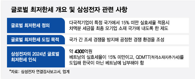 삼성전자는 "베트남의 유효세율이 15% 미만"이라며 "베트남의 QDMTT 도입에 따라 해당 법인세를 당기 법인세 비용으로 인식하고 있다"고 밝혔다. 베트남에서 내는 추가 세금 외 다른 글로벌 최저한세 관련 사안에 대해선 "영향 금액이 없거나 미미할 것"이라고 했다.