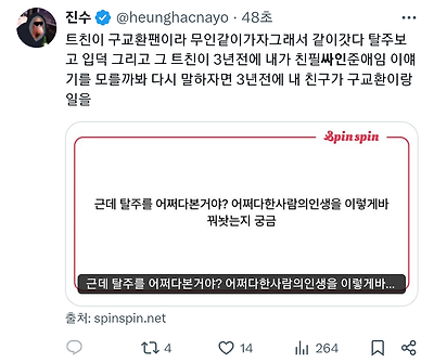 (진수 : 트위터 인플루언서. 말 웃기게 하는 바비팬으로 유명해졌는데 작년에 탈주보고 구교환 팬까지 된 사람)
