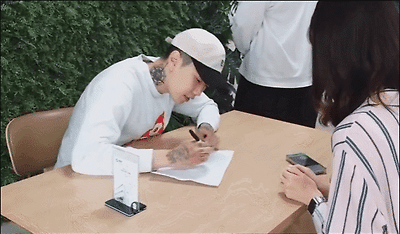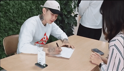 직원: 재범씨가 싸인을 하고있습니다! 문신이....조금 색다르네요...?