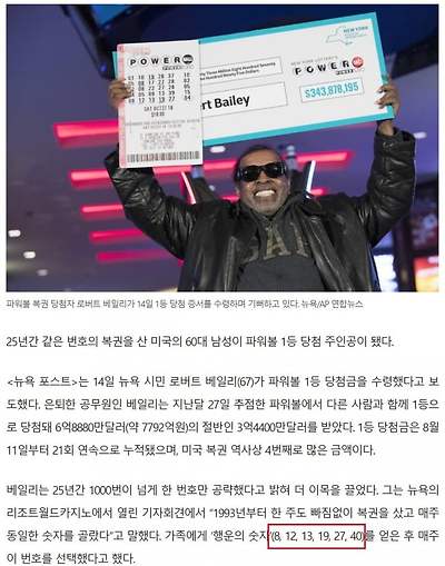 1. 미국에서 흑인 남자가 25년간 같은 번호로 파워볼을 사다가 당첨됨