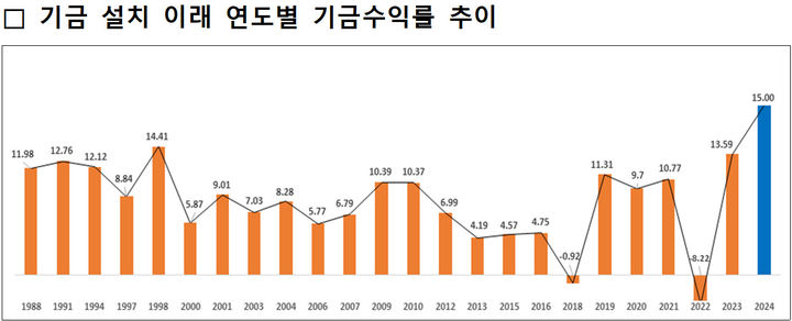 이는 1988년 국민연금에 기금이 설치된 이후 가장 높은 수익률이다. 기금 설치 이후 수익률은 연평균 6.82%를 기록했으며, 누적 운용 수익금은 총 738조원으로 집계됐다.