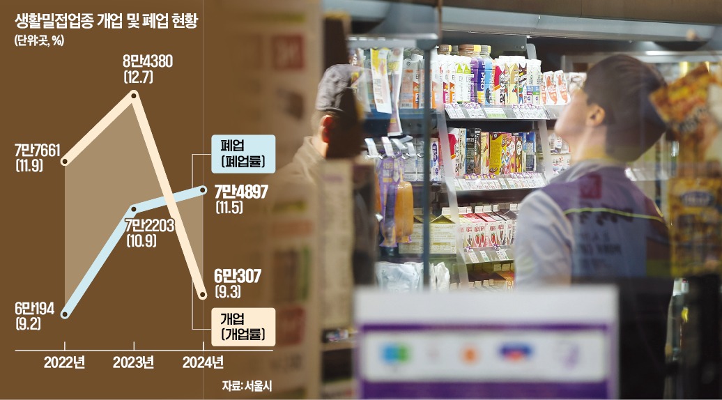 28일 서울시 상권분석 서비스 통계를 들여다보면 지난해 가게를 개업한 자영업자가 크게 줄었다는 사실이 먼저 눈에 띈다. 내수 경기가 악화하자 창업을 유보하거나 포기한 것으로 해석됐다. 서비스업과 외식업, 소매업 등 ‘생활 밀접 업종’ 개업 업체는 2022년 7만7661개에서 2023년 8만4380개로 증가했지만 지난해엔 6만307개로 고꾸라졌다. 지난해 이들 업종의 개업률(전체 사업체 대비 개업한 업체 수)은 9.3%로, 전년도 12.7%보다 3.4%포인트 급락했다.