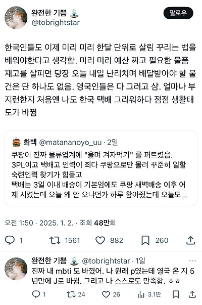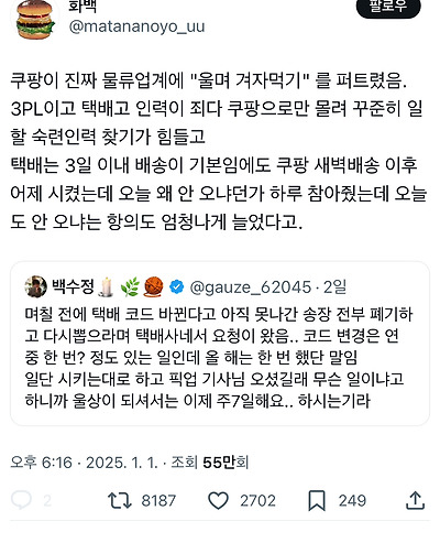 이슈 쿠팡이 진짜 물류업계에 "울며 겨자먹기" 를 퍼트렸음.twt