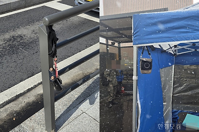 서울역 광장 인근 철제 울타리에 전도 내용이 녹음된 휴대용 확성기가 걸려있는 모습(왼쪽)과 무인 종교 단체 천막 부스에 전도 내용이 녹음된 휴대용 확성기 걸려있는 모습(오른쪽). 두 확성기에선 근처의 시민들이 눈을 찡그리거나 귀를 막을 정도로 큰 소리로 전도 목소리가 흘러나오고 있었다. /사진=이민형 기자