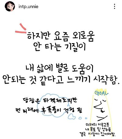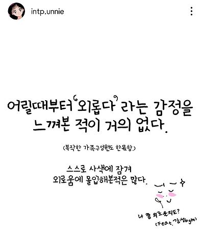 출처: 여성시대 (학마을)원 출처인스타 인팁언니나 인팁인데 외로움 당연히 느끼고 걱정되는 순간도 있는데 사람은 누구나 혼자고 외로움을 가지고 있어 특이한게 아니야 생각하다보면 또 그렇게 안심각해짐