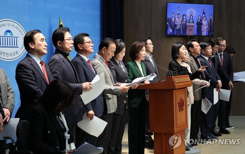 국민의힘 의원들이 12일 서울 여의도 국회 소통관에서 기자회견을 열고 헌법재판소에 2차 공개탄원서를 제출하기에 앞서 윤석열 대통령 탄핵 심판 과정의 절차적 하자 등을 주장하고 있다. 2025.3.12