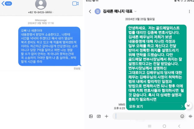 다만 김수현 측이 공개한 법률대리인이 김새론 측에 보낸 메시지 캡처본에 따르면, 해당 메시지는 지난해 3월 25일로 되어 있다. 이는 지난해 김새론이 자신의 SNS에 김수현과 함께 찍은 사진을 올린 3월 24일 바로 다음 날이다.