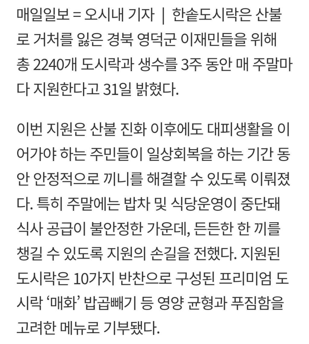 한솥도시락, 산불피해 지역에 도시락 2240개 지원…매 주말 식사 제공
