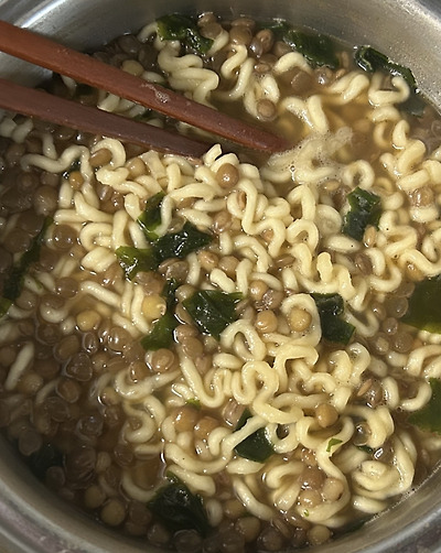 국물을 버리고 렌틸콩과 얼음을 넣은 너구리..