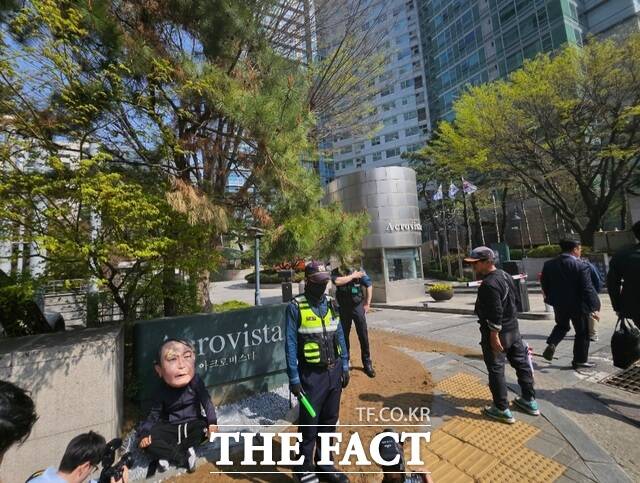 윤석열 전 대통령이 11일 오후 서울 한남동 관저를 떠나 서초동 사저 복귀를 준비하고 있는 가운데 탄핵을 찬성하는 지지자가 아크로비스타 아파트 앞에서 퍼포먼스를 하고 있다.