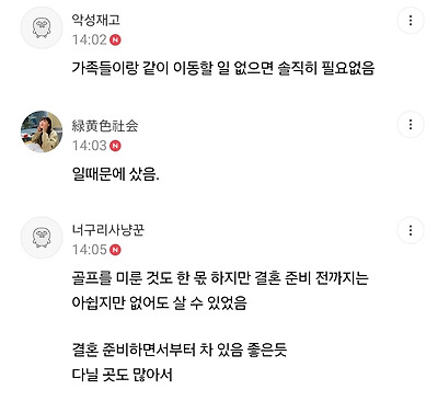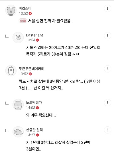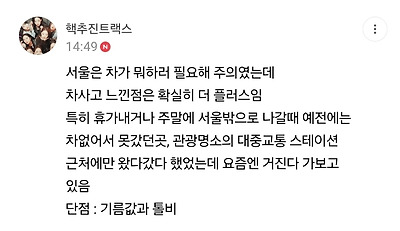 ㅊㅊ ㄷㅇㅋㅍ서울은 대중교통이 촘촘하고24시간 대중교통이 운영되니까경험상 자차가 필요 없다는중고차 유튜버차라리 택시타고렌트카 빌려서 다니는게 낫다가족이 생기면 같이 이동하기 좋고,외곽으로 나가는 일이 잦다면 무조건 좋다서울에서 산다는 기준임