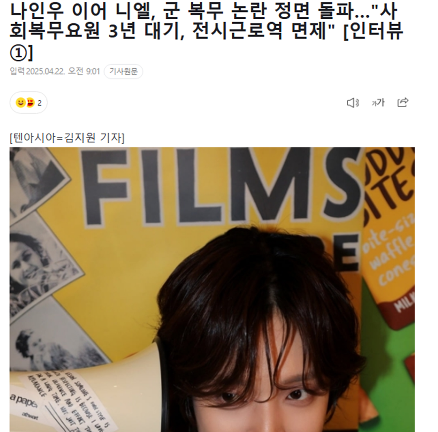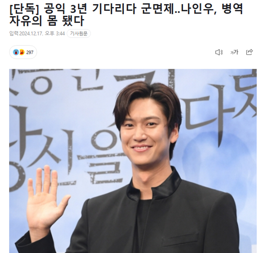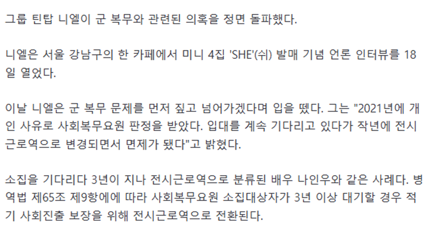 오늘 니엘이 장기 대기로 군대 면제 되었다는 기사가 나옴