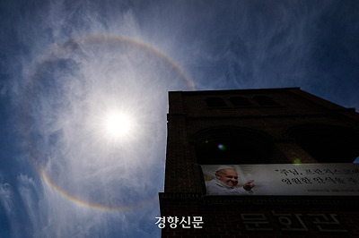 프란치스코 교황의 선종 이후 서울 명동대성당에 공식 분향소가 설치된 가운데, 23일 대성당 위로 원형의 무지개인 햇무리가 떴다. 햇무리는 태양 주변으로 동그랗게 무지개가 나타나는 자연현상으로, 이날 하늘 위에 선명히 떠 오르며 조문객들의 눈길을 끌었다.