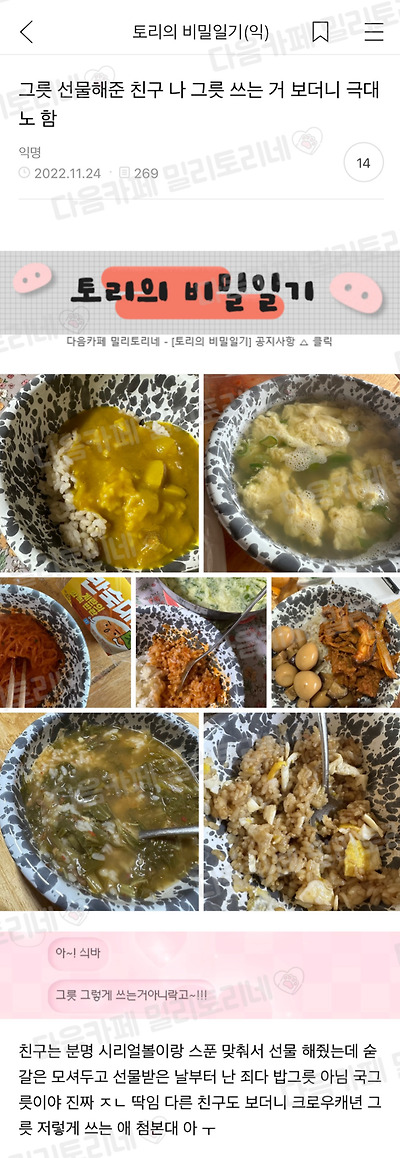 그릇 선물해준 친구 나 그릇 쓰는 거 보더니 극대노 함
