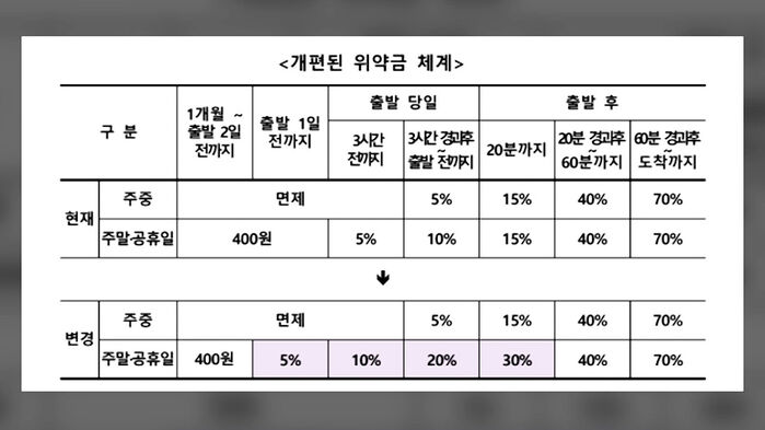 지금은 출발 하루 전까지는 400원, 출발 전까지는 최대 10%의 수수료가 부과되고 있는데 앞으로는 출발 시각을 기준으로 하루 전에는 5%, 출발 당일 3시간 전까지는 10%, 3시간 전부터는 또 3시간 전부터 출발 직전까지는 20%로 상향 조정되는 겁니다.