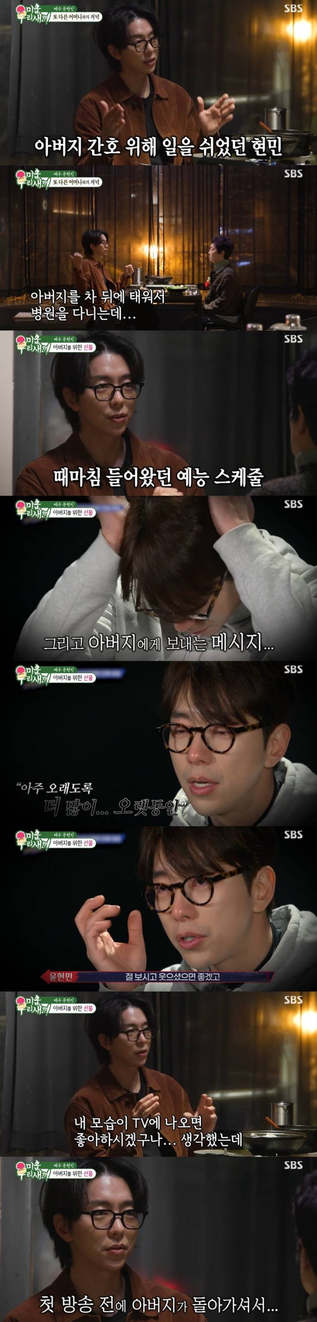 윤현민은 "이 집 지은 것도 아빠랑 살려고 한 것"이라며 "자주 왔다 갔다 했으면 좋겠다고 한 거 아니냐. 아빠가 시한부 선고받았으니까. 같이 산 적이 없으니까 나랑 같이 살아야겠다고 해서 이 집을 택한 건데"라며 "난 병원 출퇴근하면 되니까. 어느날 갑자기 하반신 마비가 되면서 여긴 다 계단이라 의미가 없지 않냐"라며 함께 못살게 됐다고 이야기했다.