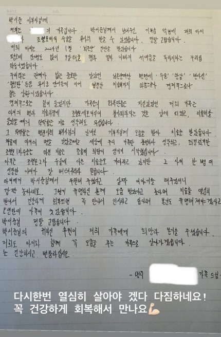 박서준은 29일 자신의 SNS 계정에 “다시 한번 열심히 살아야 겠다 다짐하네요! 꼭 건강하게 회복해서 만나요!”라는 멘트와 함께 한 환우의 가족으로부터 받은 자필 편지를 공개했다.