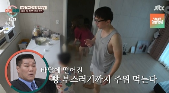 그럼에도 남편은 아이가 남긴 밥 등 잔반 처리하기 시작했고, 식탁은 물론 바닥에 떨어진 음식까지 주워 먹는 상황이 펼쳐졌다. 또 설거지하려고 담가둔 그릇에 있는 음식물을 본 아내는 남편에게 화를 냈고 당황한 남편은 버려진 음식을 주워 먹었다.
