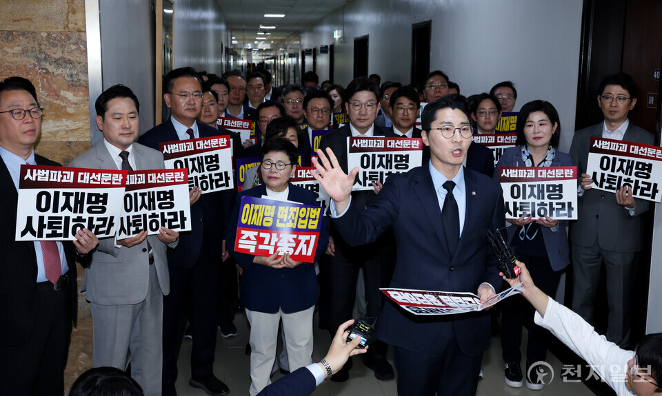 7일 오후 서울 여의도 국회 법제사법위원회 전체회의장 앞에서 국민의힘 의원들이 ‘이재명 면죄입법 즉각중지’ 등의 내용이 적힌 손팻말을 들고 피켓시위를 하고 있다.