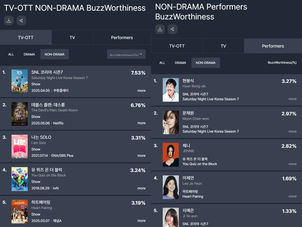 화제성 1위는 'SNL코리아', 상승률 1위는 '데블스 플랜2'였다.