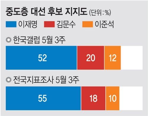 중도층 지지율은 이재명 후보 52%, 김 후보 20%, 이준석 후보 12%로 집계됐다. 전국지표조사에서도 중도층의 이재명 후보 지지율은 과반(55%)으로 나타났다.