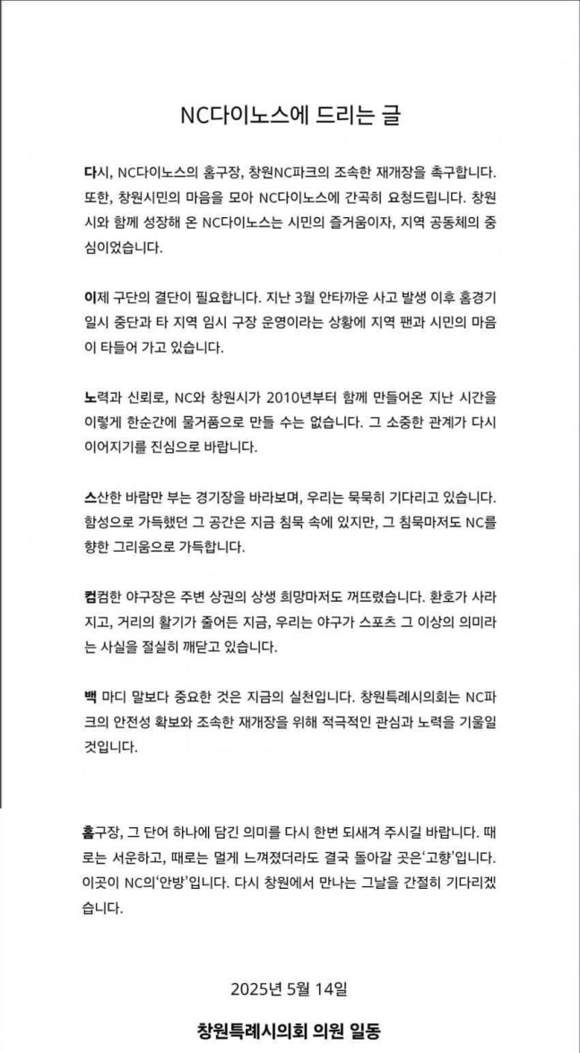 창원시의회는 'NC파크의 조속한 재개장을 촉구한다. 구단의 결단이 필요하다'고 주장하고 있다. 시의회는 재개장 여부에 대한 타자가 아니라 주체다. NC파크는 만석시 선수단과 관계자 포함 1만8000명이 넘는 사람이 한자리에 모이는 시설이다. 이미 사고는 터졌고, 이제 안전이 최우선이다. 이 과정에서 사용자인 NC 구단의 의사가 최우선으로 존중돼야한다.
