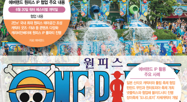 18일 관광·레저업계에 따르면 에버랜드는 다음달 20일 개막하는 워터 페스티벌 여름 축제에서 원피스와 콜라보레이션을 준비 중이다. 원피스는 해적왕을 꿈꾸는 루피와 밀짚모자 해적단의 모험 스토리를 담은 작품으로 일본은 물론 전세계적으로 팬덤을 형성하고 있다. 그동안 원피스가 국내에서 소규모 팝업을 한적은 있지만, 에버랜드 같은 테마파크와 대규모 협업을 진행하는 것은 처음이다. 에버랜드 관계자는 “매년 여름 물을 주제로 축제를 펼치는데 바다로 항해를 떠나는 원피스 세계관이 워터 페스티벌과 잘 맞아 콜라보를 기획하게 됐다”고 설명했다.