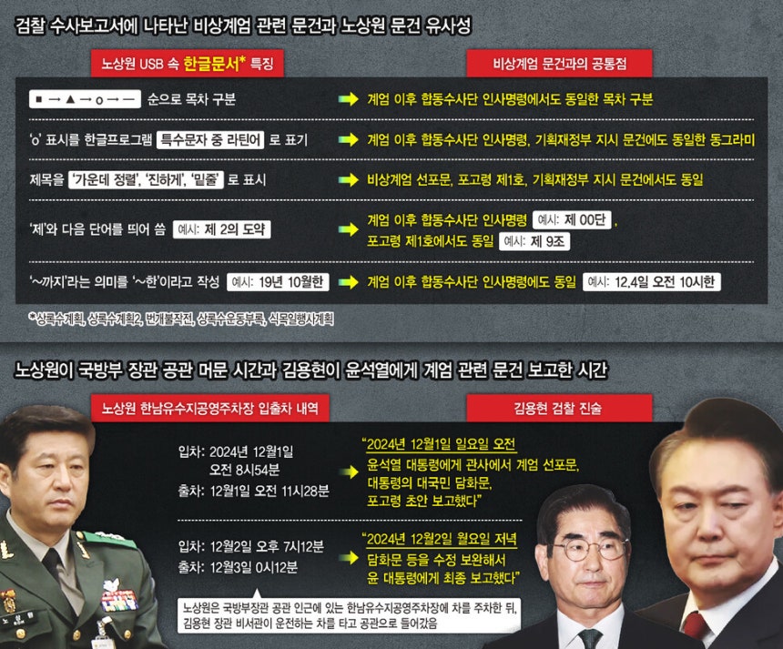 검찰은 수사보고서에서 “노상원의 주거지에서 압수한 USB(유에스비)의 한글문서들은 견명조·견고딕·궁서체·신명조로 작성되어 있으며, 큰 목차에서 작은 목차로 단락을 구분할 때 ‘■ → ▲ → o → —’ 순서로 표시한다는 공통점”이 있다고 짚었다. 이런 방식의 표기는 김용현 전 국방부 장관이 비상계엄 직후 합동수사본부 인사발령을 위해 국방부 인사기획관에게 전달한 ‘국방부 일반명령’에도 똑같이 등장했다.