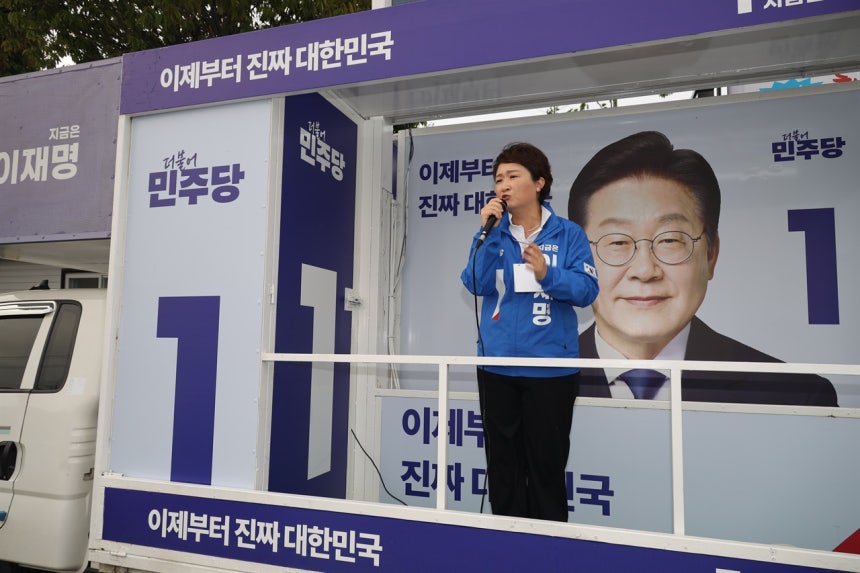 | ▲ 이언주 선대위원장 경남을 찾아 이재명 후보의 지지를 호소하고 있다 |