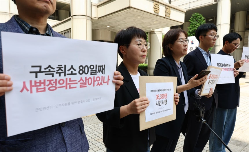 윤씨가 법원에 들어가고 얼마 후인 오전 10시30분 참여연대와 민변, 군인권센터는 서울중앙지법 동관 앞에서 '윤석열 재구속 촉구 서명 및 의견서 전달 기자브리핑'을 열었다.