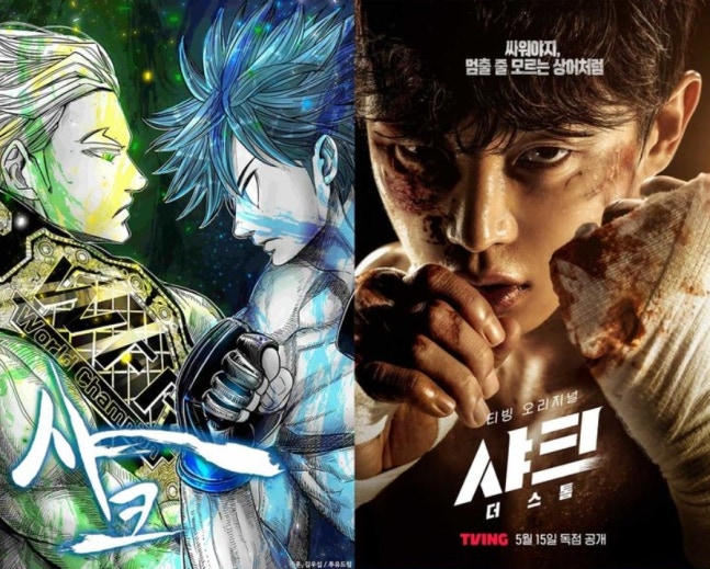 웹툰 샤크(왼쪽)과 티빙 오리지널 ‘샤크:더 스톰’. 카카오엔터 제공