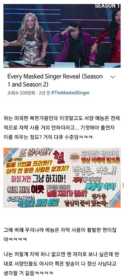 개인적으로 나는 무한도전 같은 예능은 자막이 다 살린다고 생각해서 우리나라 예능이 더 재밌음ㅋㅋㅋ