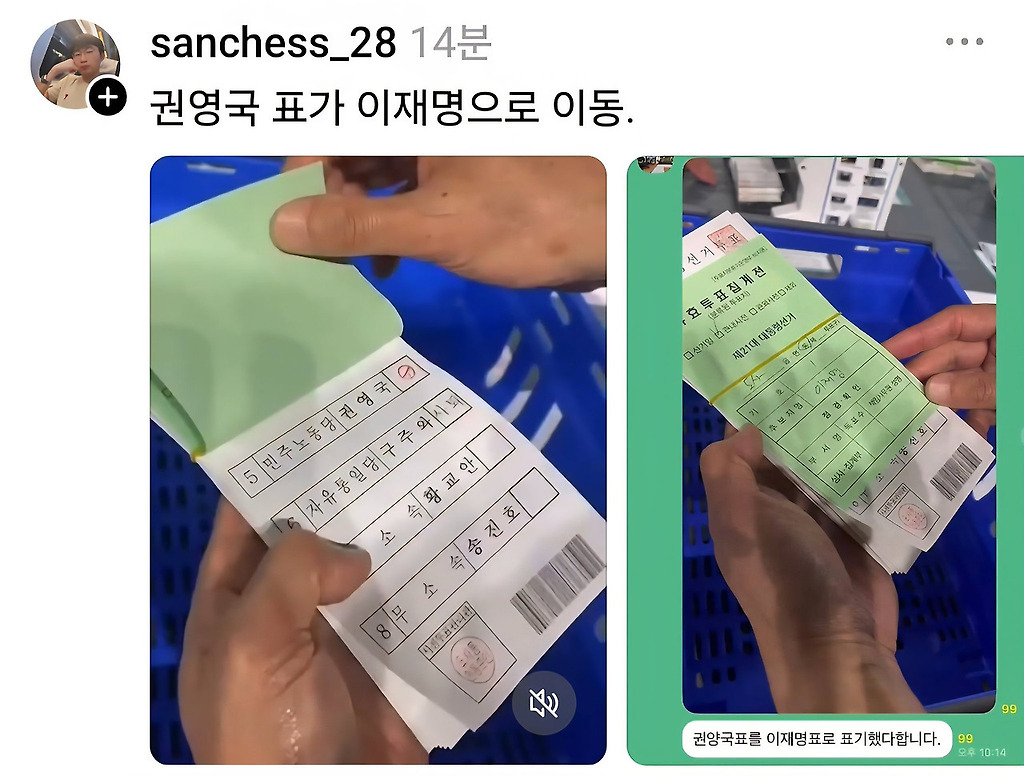 * 참고로 뭉치로 겹쳐진 투표용지 올린 사진도 잘 보면 다른 후보(이준석)에게 투표한거랑 섞여있음