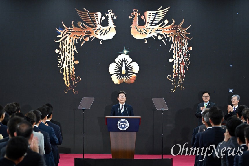 | ▲ 이재명 대통령이 4일 오전 서울 여의도 국회 의사당에서 열린 제21대 대통령 취임선서식에서 취임선서를 마치고 있다. 이 대통령 뒤로 봉황 문양이 보인다. |