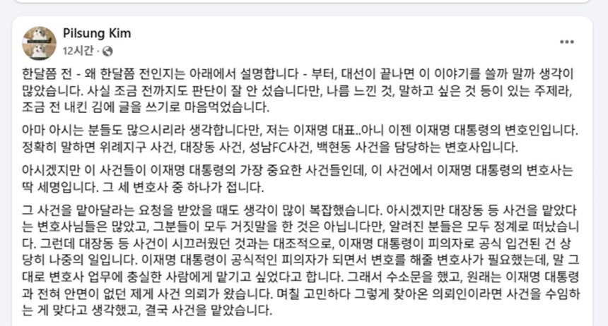 | ▲ 이재명 대통령의 주요 사건을 변호했던 김필성 변호사가 대선 이후 자신의 경험과 생각을 담은 글을 공개했다. |