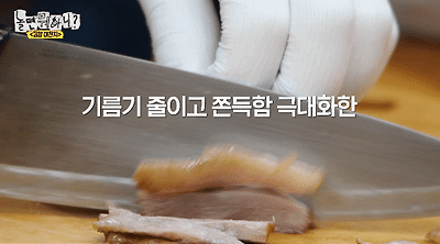 고기는 식감을 살려 얇게 썬다고 하심