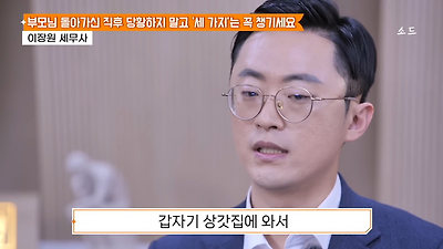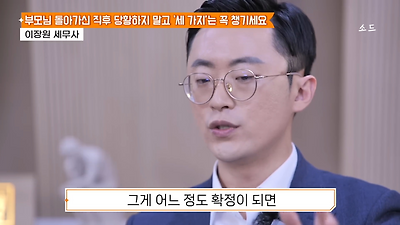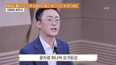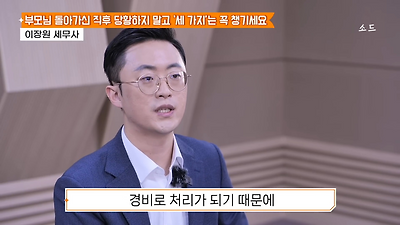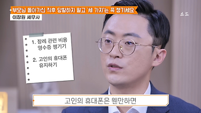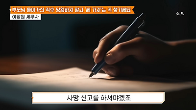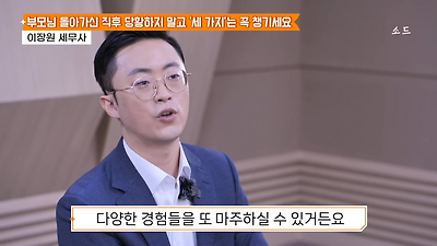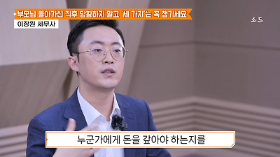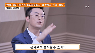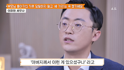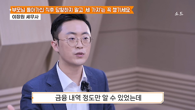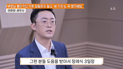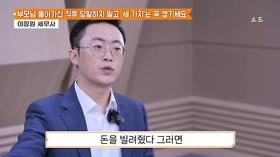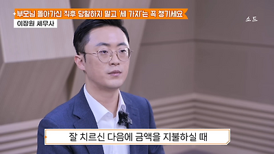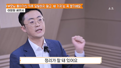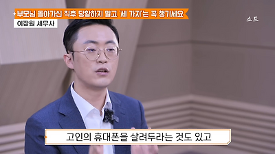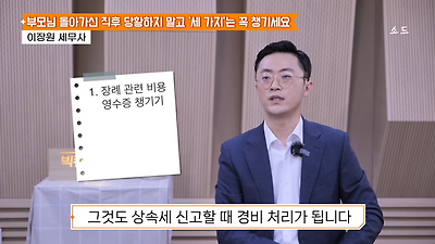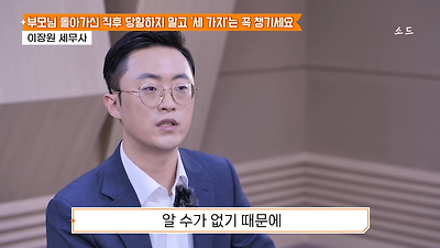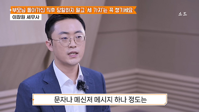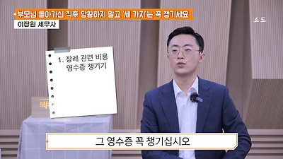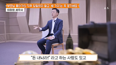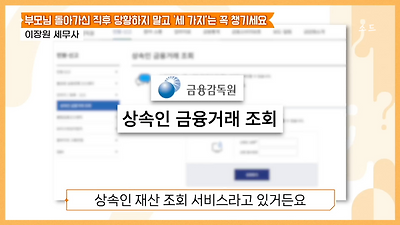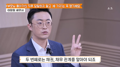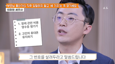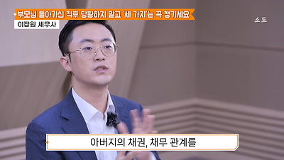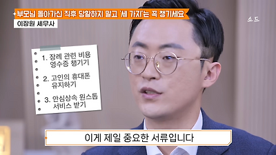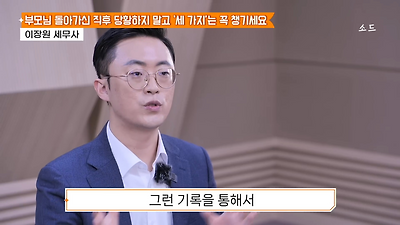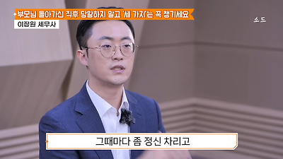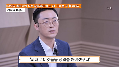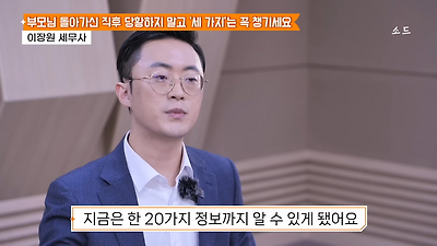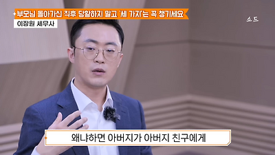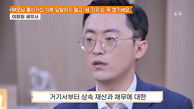 ㅊㅊ ㄷㅇㅋㅍSBS 비즈 프로그램 빅퀘스천에서 상속전문 세무사가 상속세 관련 얘기한건데 앞부분만 캡쳐* 하단에 요약있음 *경황이 없어 경고문구 못볼 수 있음1. 장례비용등 영수증 챙기기 (상속세 경비처리됨)2. 고인의 휴대폰, 메신저 유지하기 (채권채무관련 증거등)3. 사망신고시 안심상속원스톱서비스 신청 -> 금융감독원 상속인 금융거래조회,출력
