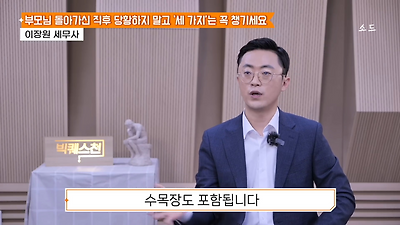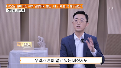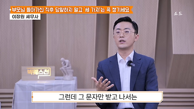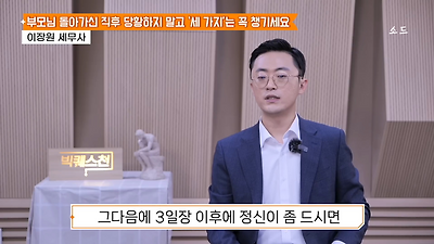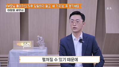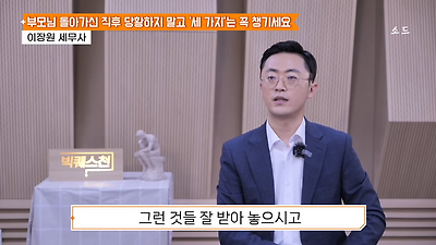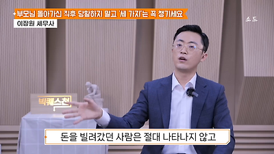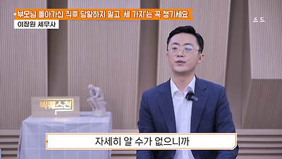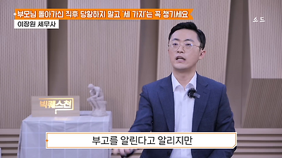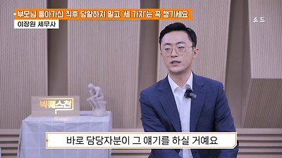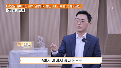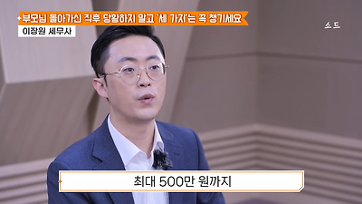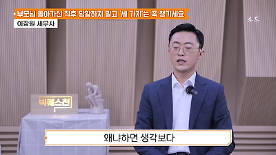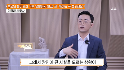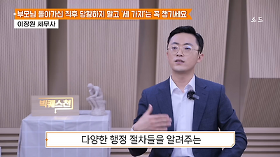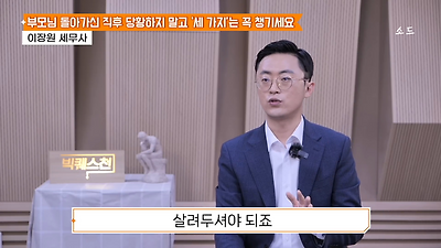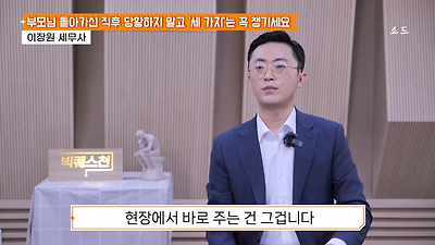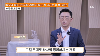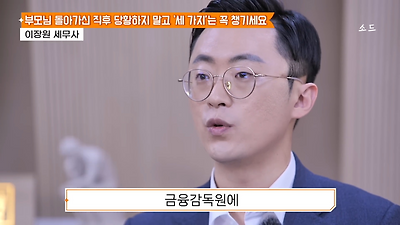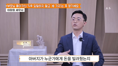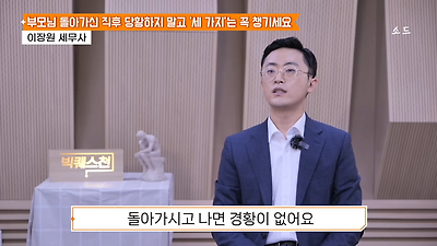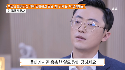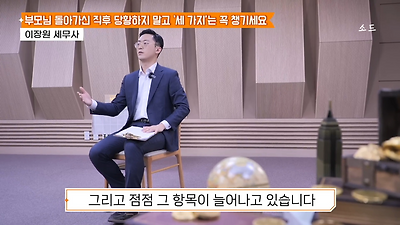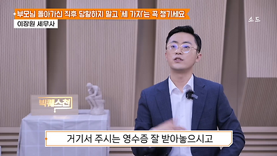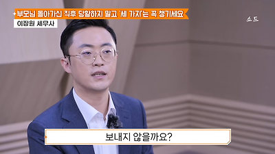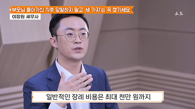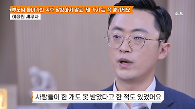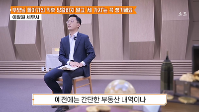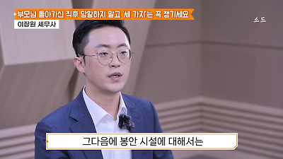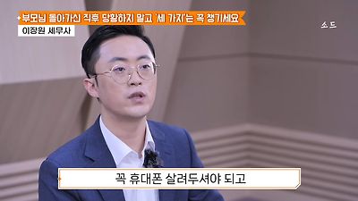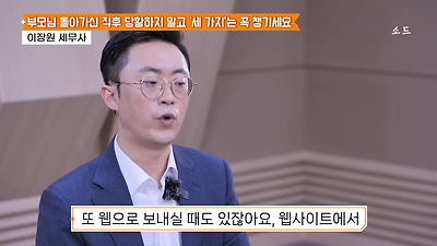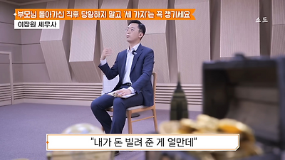 ㅊㅊ ㄷㅇㅋㅍSBS 비즈 프로그램 빅퀘스천에서 상속전문 세무사가 상속세 관련 얘기한건데 앞부분만 캡쳐* 하단에 요약있음 *경황이 없어 경고문구 못볼 수 있음1. 장례비용등 영수증 챙기기 (상속세 경비처리됨)2. 고인의 휴대폰, 메신저 유지하기 (채권채무관련 증거등)3. 사망신고시 안심상속원스톱서비스 신청 -> 금융감독원 상속인 금융거래조회,출력