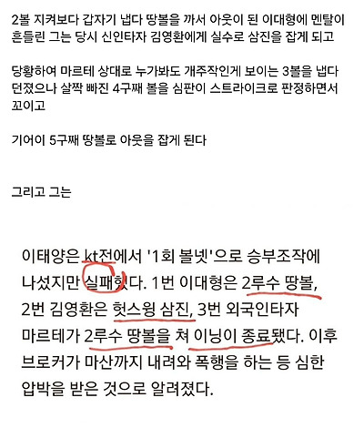 브로커가 1회에 볼넷 던지라고 지시했고 실제로 작정하고 볼 던졌는데 타자들이 다 휘둘러버려서 실패함