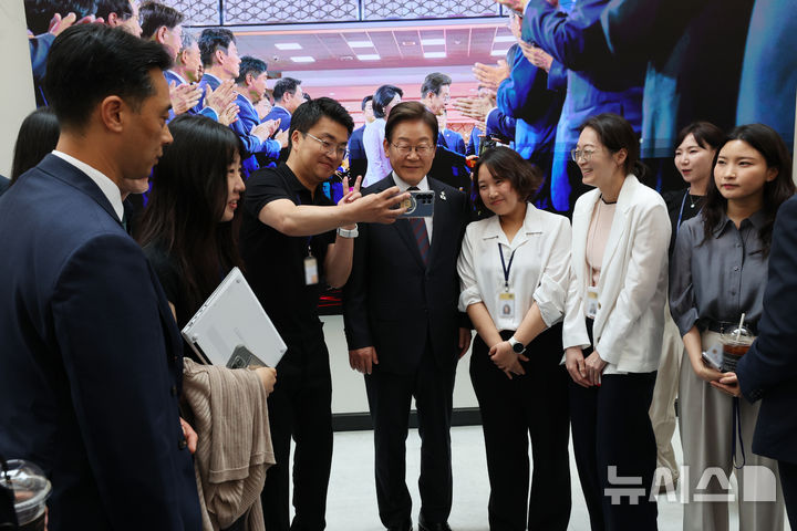 이재명 대통령이 10일 서울 용산구 대통령실 청사에서 입주업체 관계자와 대화를 하고 있다. 2025.06.10.
