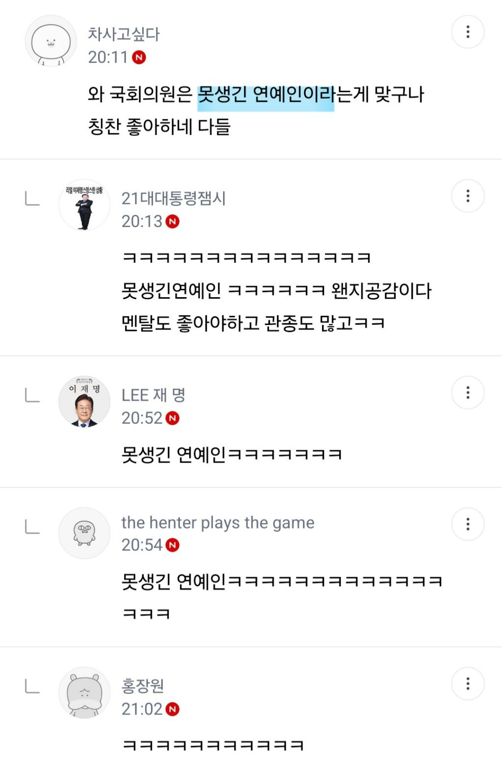 국회의원=못생긴 연예인=관심 받는거 좋아함 ㅋㅋㅋㅋㅋㅋ