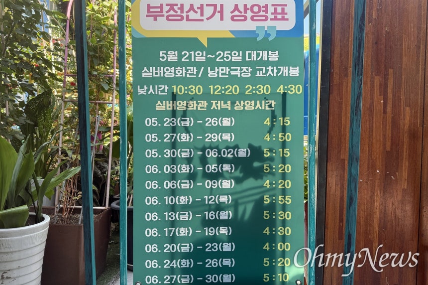 <오마이뉴스>가 11일 찾은 서울 종로구 낙원상가 4층 실버영화관, '허리우드클래식' 상영관과 '낭만극장' 상영관에서 5월 21~25일 매일 4번 다큐멘터리 영화 <부정선거, 신의 손인가>를 상영했다는 안내문이 걸려 있었다. 또한 허리우드클래식 상영관에는 5월 23일~6월 30일 매일 오후 이 영화를 1회씩 상영한다는 공지도 붙어 있었다. 상영관 앞에는 "6월 3일 부정선거 확신한다!"라는 문구가 크게 담긴 포스터도 꽂혀 있었다. 해당 영화는 부정선거 음모론을 다룬 것으로 이영돈 PD가 제작했으며, 지난 5월 21일에는 전직 대통령 윤석열씨가 공개 관람해 논란이 됐다.