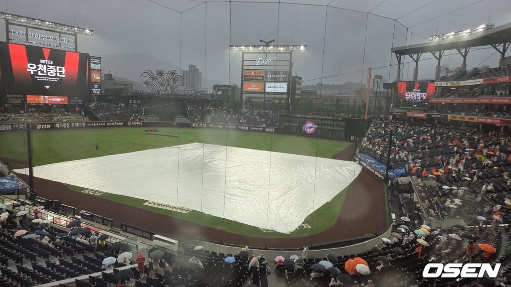 15일 대전 한화생명볼파크에서 열린 LG 트윈스와 한화 이글스 경기 도중 5회말 갑자기 소나기가 쏟아졌다.