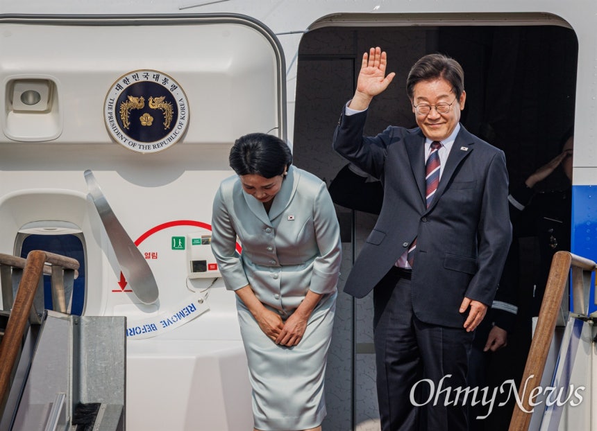 ▲  이재명 대통령이 16일 오후 경기 성남 서울공항에서 주요 7개국(G7) 정상회의 참석을 위해 캐나다로 출국하는 비행기에 올라 인사하고 있다.