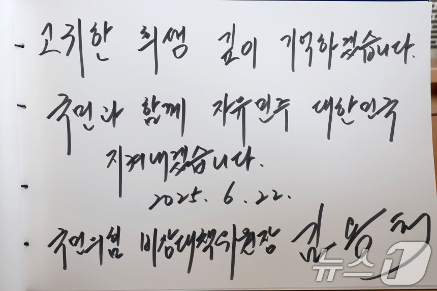 (서울=뉴스1) 이광호 기자 = 김용태 국민의힘 비상대책위원장이 22일 오전 서울 동작구 국립서울현충원을 찾아 현충탑 참배를 마친뒤 '고귀한 희생 깊이 기억하겠습니다. 국민과 함께 자유민주 대한민국 지켜내겠습니다'라고 방명록을 작성했다. 2025.6.22/뉴스1
