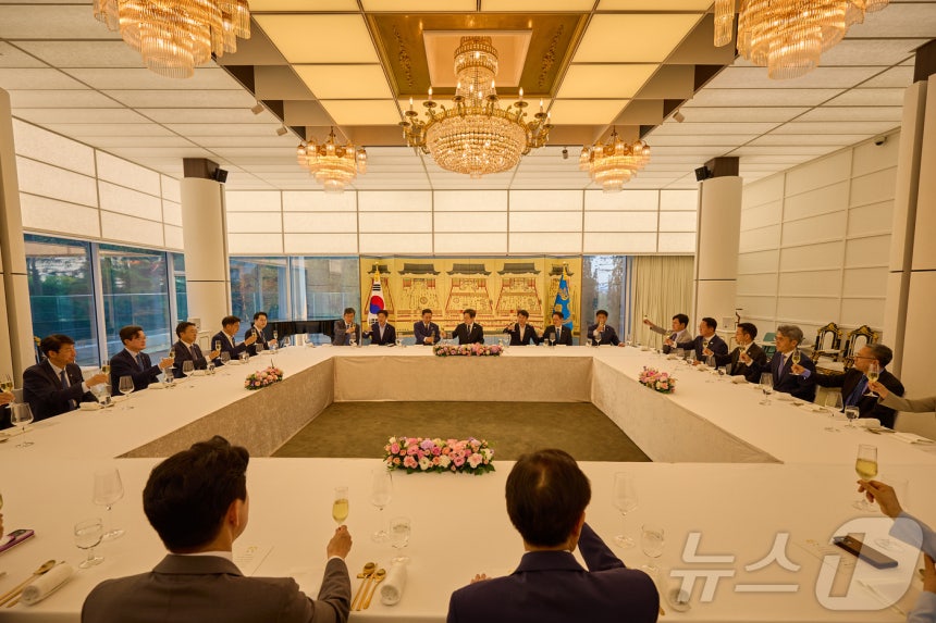 이재명 대통령이 23일 한남동 관저에서 더불어민주당 원내지도부와 만찬에 앞서 기념촬영을 하고 있다. 2025.6.23