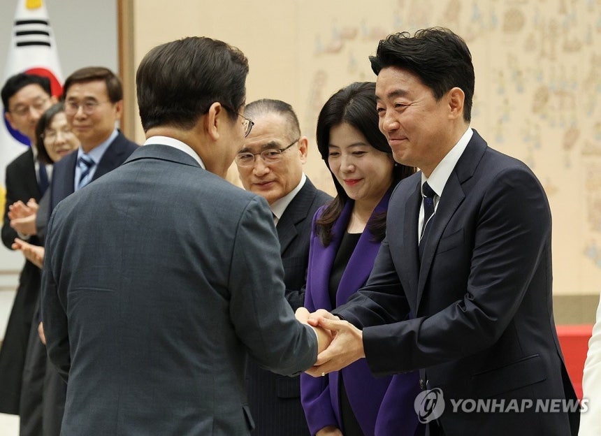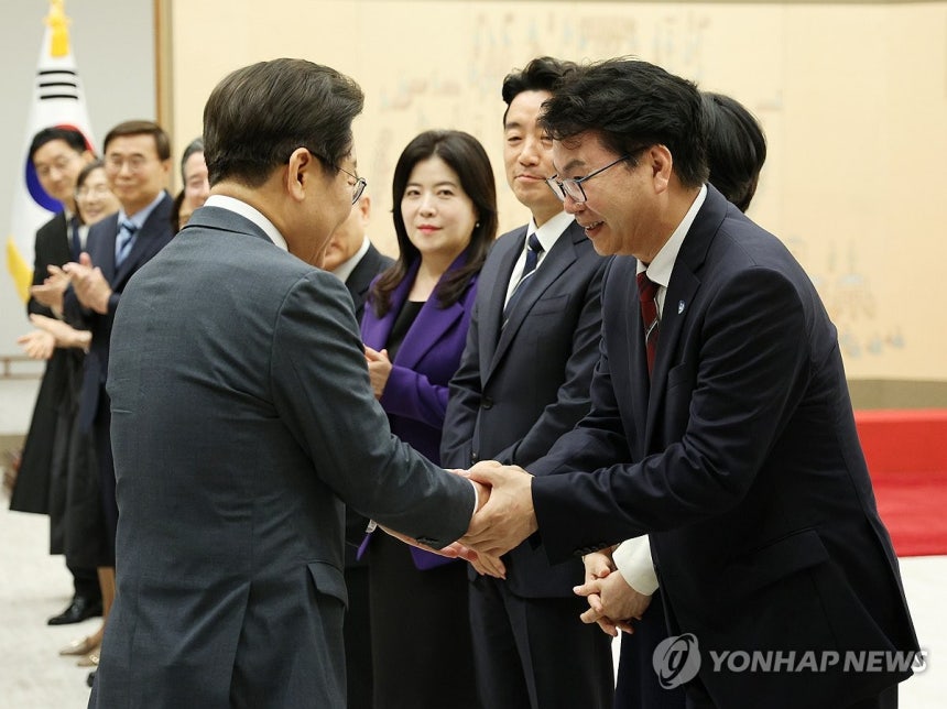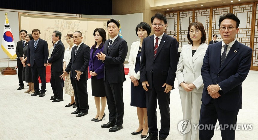 이날 이 대통령은 김민석 국무총리, 강훈식 대통령비서실장, 위성락 국가안보실장, 김용범 정책실장, 이종석 국가정보원장, 윤창렬 국무조정실장, 이한주 국정기획위원장에게 임명장을 수여했다. 2025.7.4