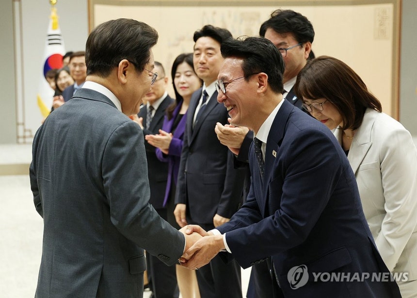 (서울=연합뉴스) 한상균 기자 = 이재명 대통령이 4일 용산 대통령실에서 임명장 수여식 참석자들과 기념촬영을 하고 있다.