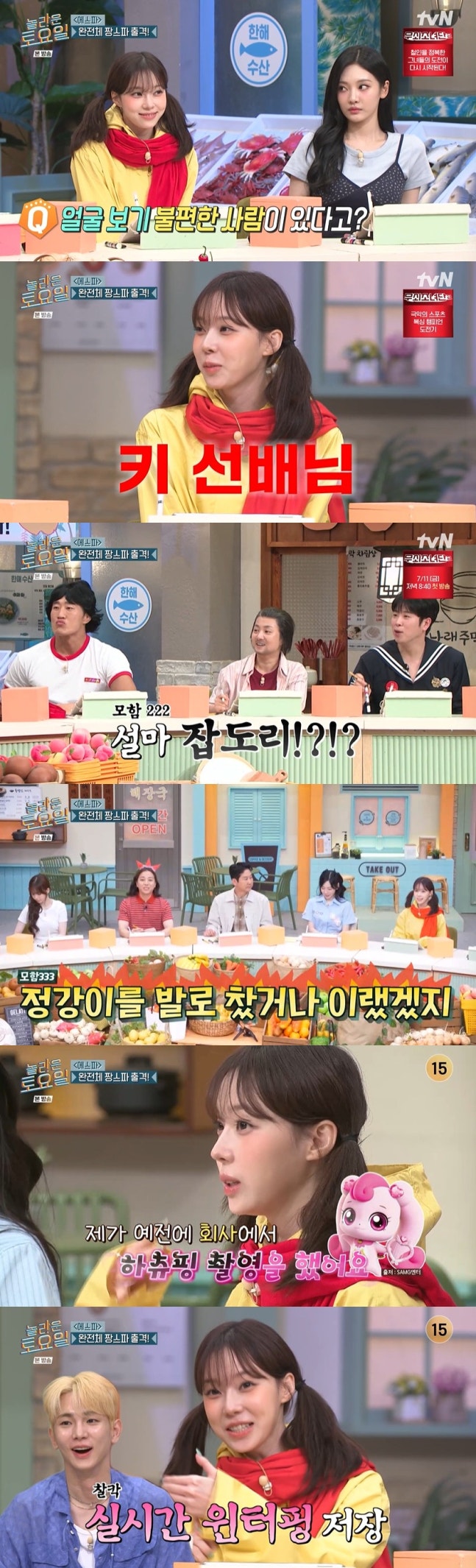 문세윤이 "쥐잡이를 했나 왜 그래"라며 모함을 시작하자 박나래는 "잡도리?"라며 거들었고, 이어 넉살은 "정강이를 발로 차거나 이랬겠지", 피오는 "성격 한번 드러냈어"라고 덧붙였다.