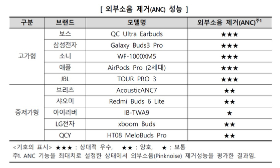 소음 제거 성능을 말하는 '노이즈 캔슬링'에선 고가 제품의 우세가 두드러졌습니다.